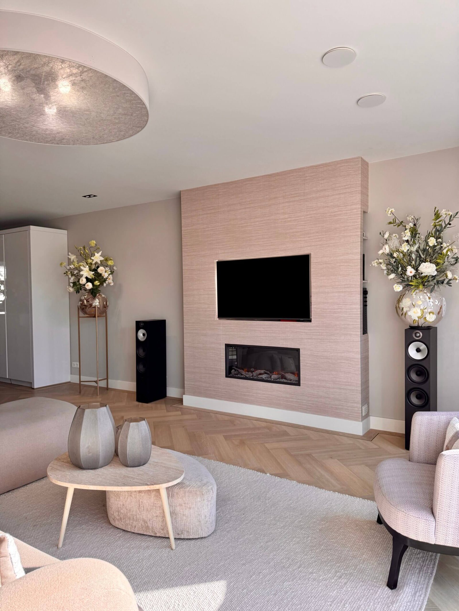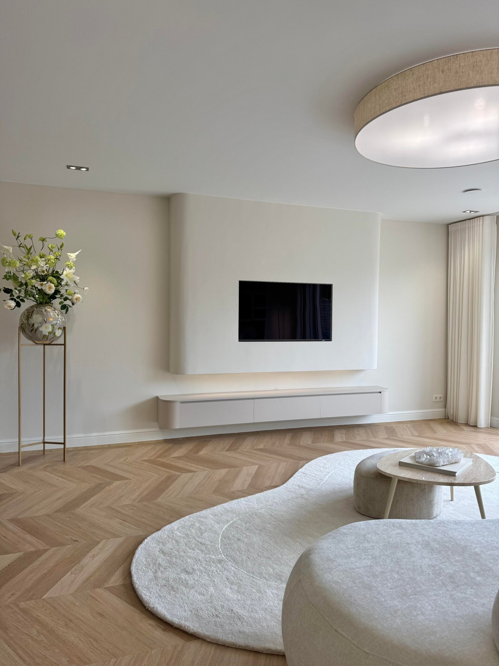 Een cinewall met ronde hoeken is al een statement, maar de finishing touch? Een ledstrip onder de zwevende wand, dit zachte licht geeft zoveel sfeer in de woonkamer.
